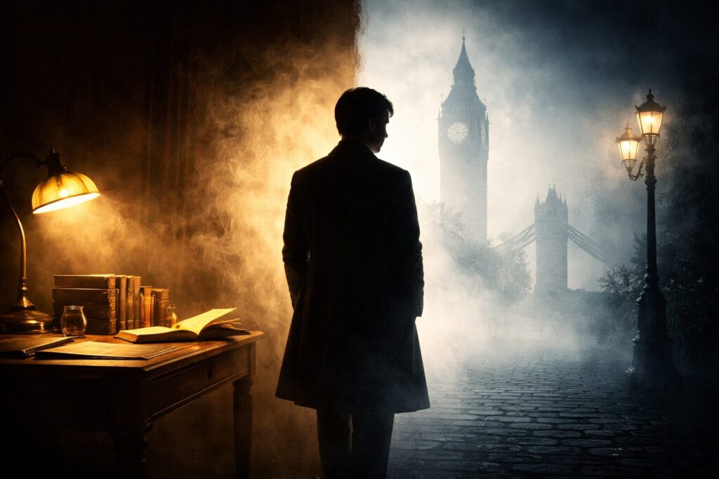 作家アーサー・コナン・ドイルと、彼が生み出した名探偵シャーロック・ホームズ。