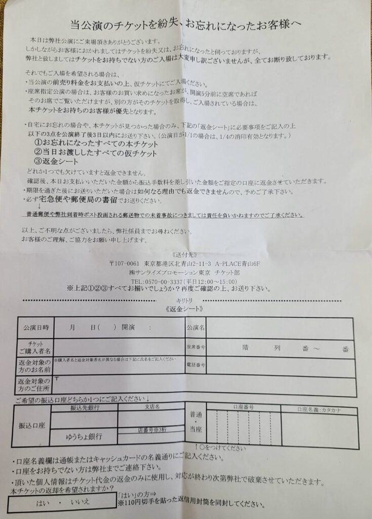 返金を希望する場合は、公演終了後3日以内に忘れてきた紙チケット、当日渡された仮チケット、